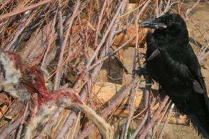 Kerry brought his hand beneath the carcass.  The other ravens caught the gesture, squawked and flew back to the ramada.  He fed some rabbit entrails to Poe, they observed. He tried baiting Never and More with intestine, but they wouldn’t take it.