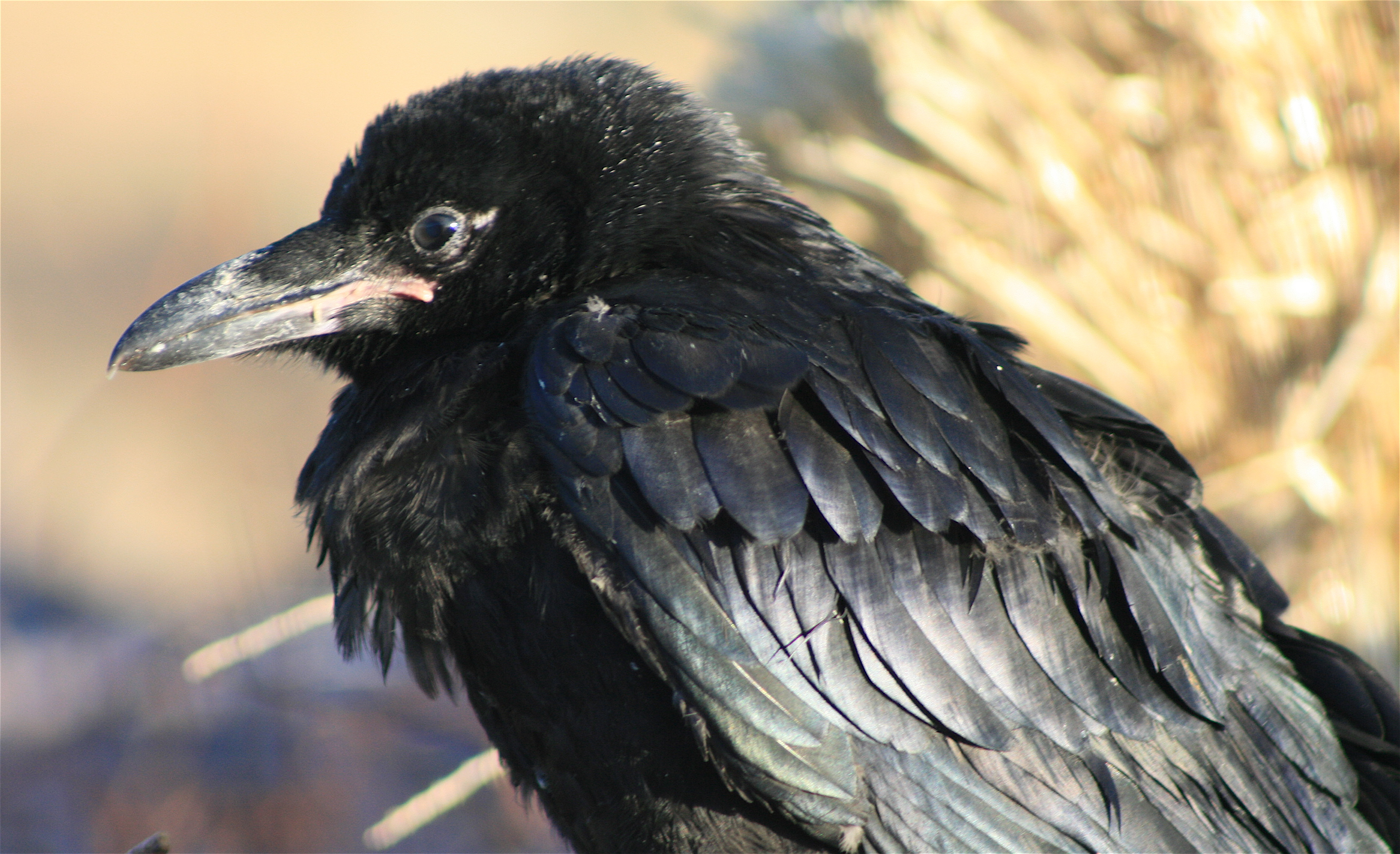 Yesterday morning, Kerry and I together went through the wash routine with the birds, now down to three (or really just two and a half). I swaddled Poe (we’ve now identified Broken Wing as him, partly due to his consistent aloofness from the other two, his blazingly independent cross-desert walks, and his consistent backward twisting of his head when we feed him), and we led the other two across the desert to the trees in the wash. Once there, we all settled down in the shade: the ravens to play, Kerry and I to talk.